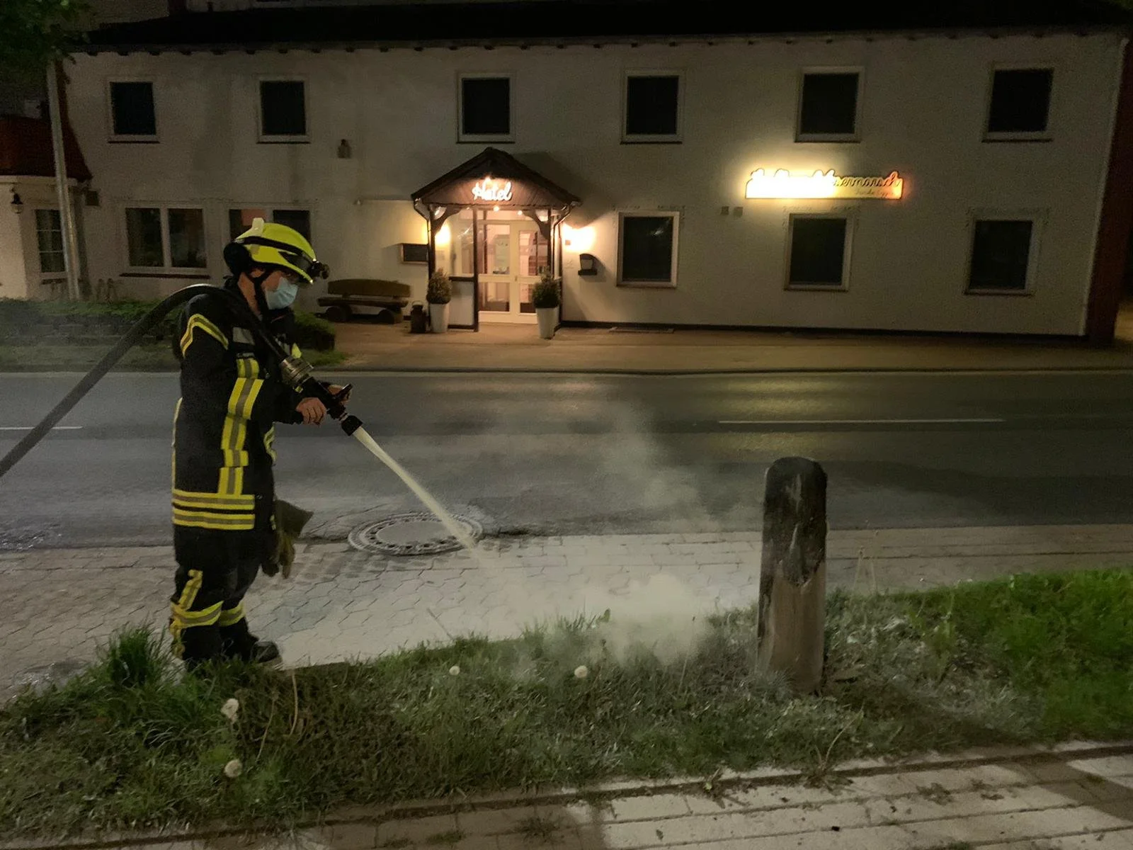 In der Nacht von Sonntag auf Montag wurden die Kameraden der Ortsfeuerwehr Baden zu einem ungewöhnlichen Einsatz an der Verdener Straße alarmiert. In Höhe eines Seniorenheims brannte ein Holzpfeiler an der Straße, Mit einem Pulverlöscher löschte konnte die Polizei das Feuer schnell löschen. Die Einsatzkräfte der Ortsfeuerwehr Baden führten lediglich Nachlöscharbeiten mit dem Schnellangriff durch und konnten dann wieder ins heimische Bett zurück.