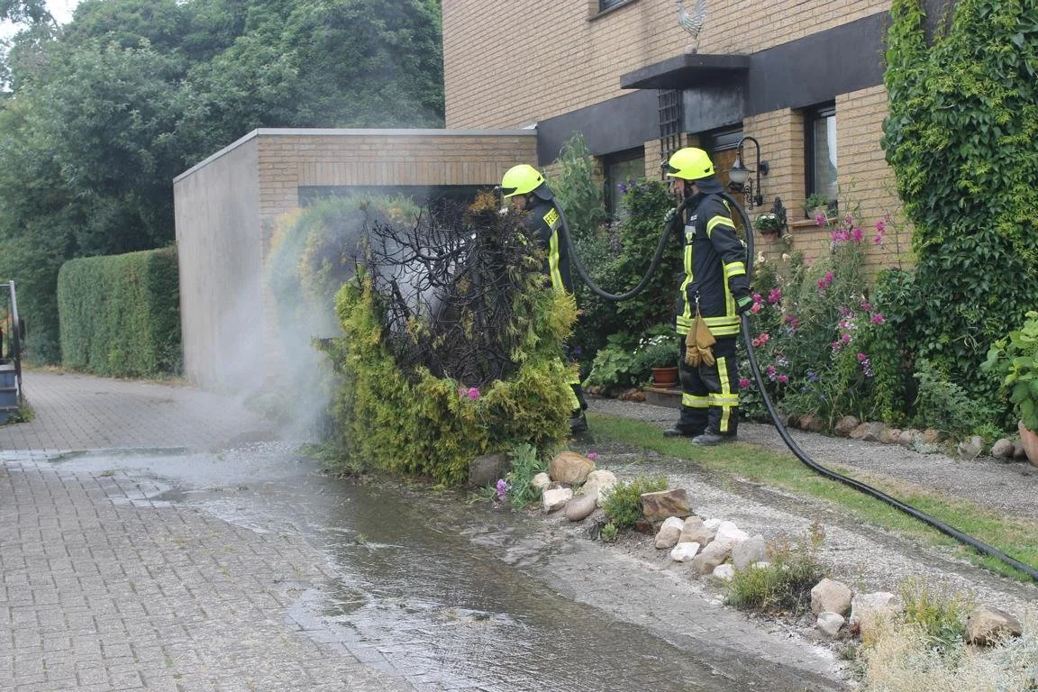 Die vor Ort auf ca. drei Metern brennende Hecke war bei Anfahrt schon von Bewohnern mit einem Gartenschlauch gelöscht worden, so dass die Einsatzkräfte lediglich Nachlöscharbeiten mit dem Schnellangriff durchführen mussten.