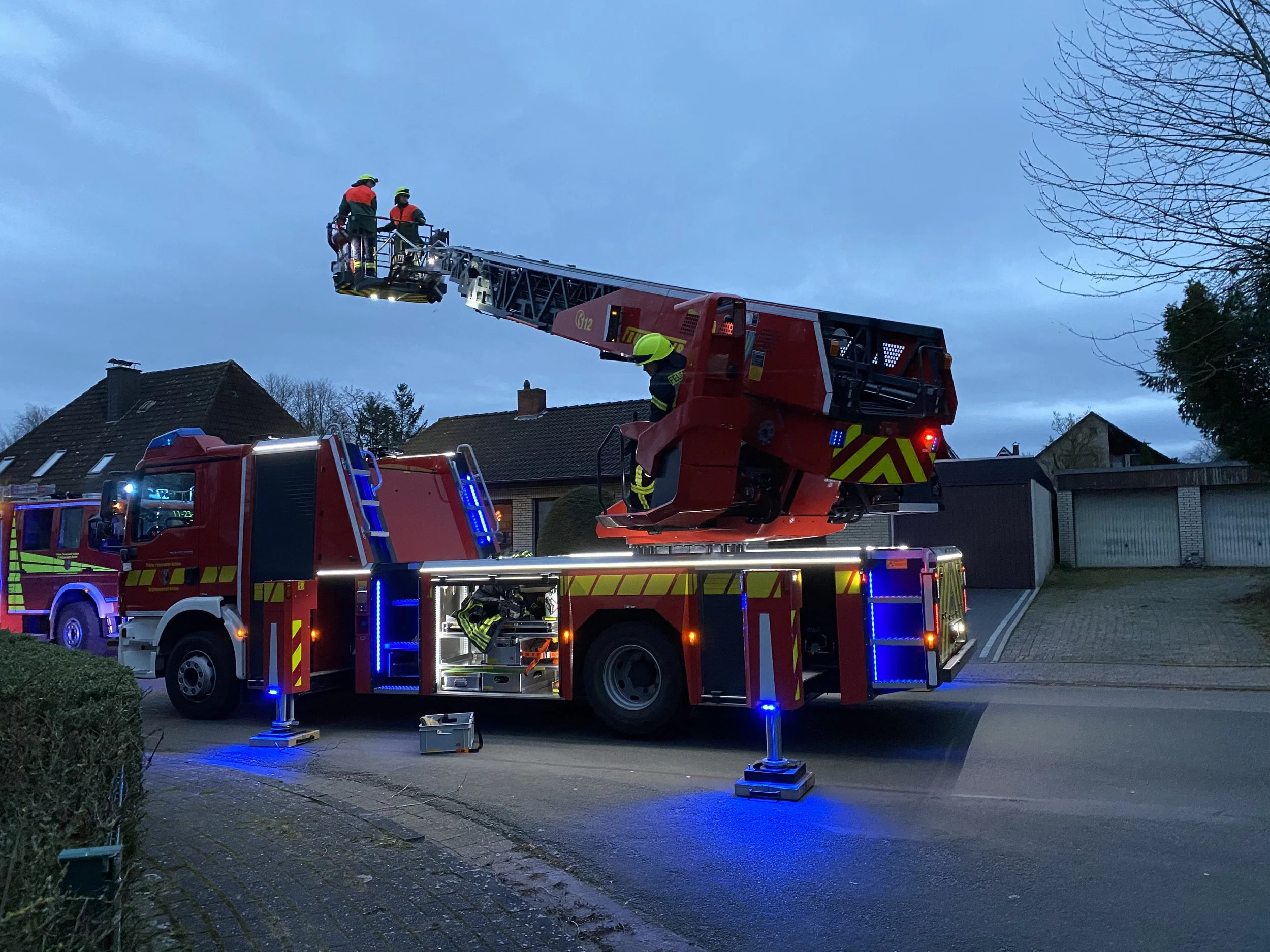 Eine abgeknickte Baumkrone drohte unkontrolliert zu Boden zu fallen. Gemeinsam mit den Kameraden der Ortsfeuerwehr Achim und ihrer Drehleiter kümmerten sich die Badener Kameraden um dieses Einsatz.