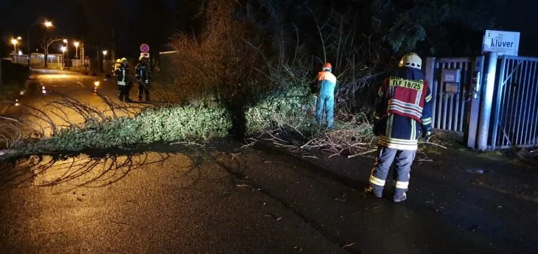 Der erste Sturm bedingte Einsatz lies nicht lange auf sich warten. Um halb sechs wurden die Einsatzkräfte der Ortsfeuerwehr Baden in den Finienweg gerufen. Vor Ort lag eine Tanne quer über der Straße. Mit der Motorsäge würde der Baum zersägt und an den Straßenrand gelegt.